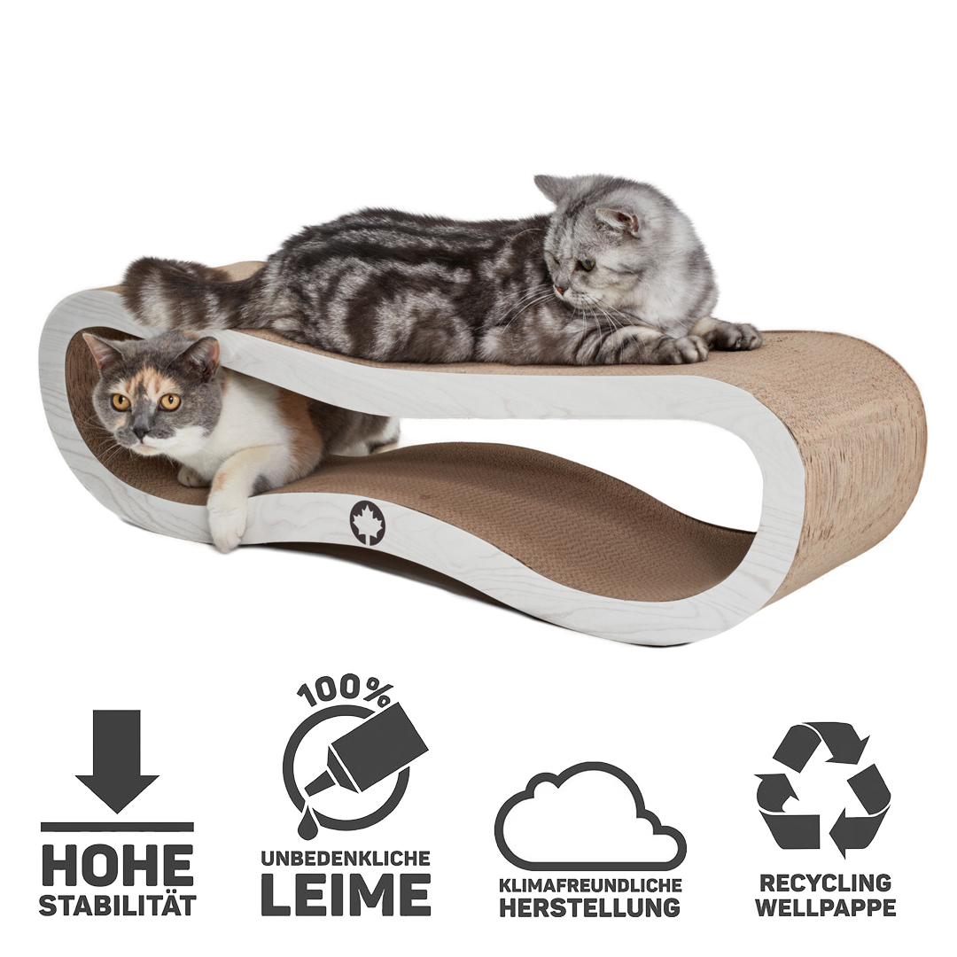 Het kattenmeubel is een welgevormde, futuristische golf voor haar leefruimte en puur plezier op twee verdiepingen voor de kat: krabben, spelen en slapen, aan beide kanten bruikbaar.